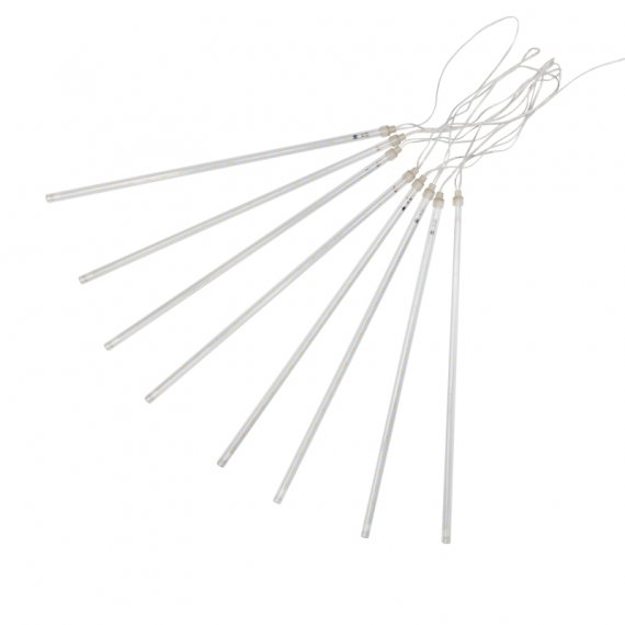 Светодиодная гирлянда «Тающие сосульки» - это оригинальное, красивое и современное средство оформления фасадов и интерьеров зданий, деревьев, витрин и т.д. Она представляет собой комплект из 8 прозрачных пластиковых трубок, расположенных на расстоянии 40 см друг от друга. По всей длине каждой трубки внутри надежно закреплена плата со светодиодами и микрочипом, обеспечивающим динамику с эффектом стекающей капли. Длина каждой трубки 50 см, диаметр 12 мм.