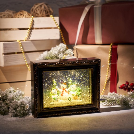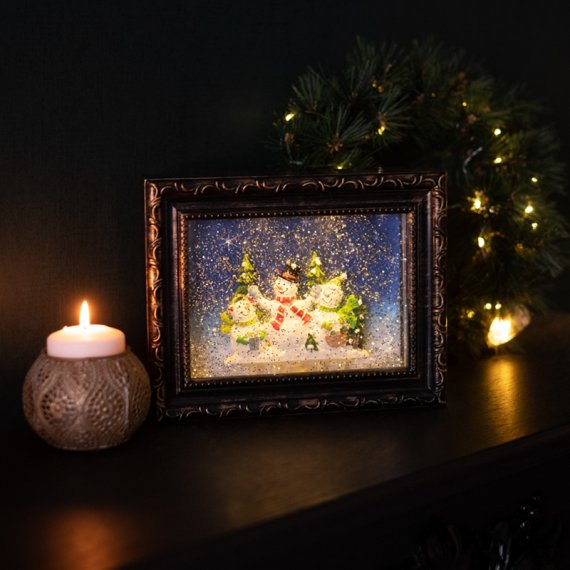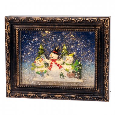 Декоративный светильник «Картина» с эффектом снегопада и подсветкой — прекрасный подарок к Новому году или Рождеству, который порадует и детей, и взрослых. Прозрачная колба наполнена жидкостью с металлизированным конфетти, которая начинает циркулировать сразу после включения. Сверкающий вихрь блесток уносит зрителей в волшебную зимнюю сказку, где главные герои — компания снеговиков — фигурки, стоящие в центре. Светильник работает от 3 элементов питания типа АА, что дает возможность использования в любом удобном месте. USB-шнур входит в комплект.