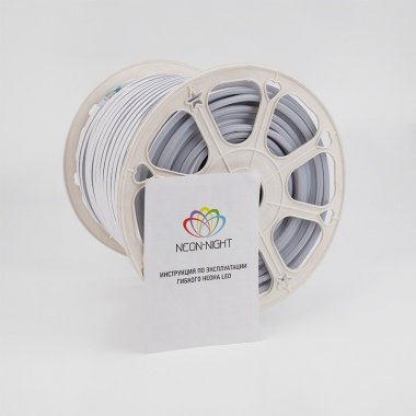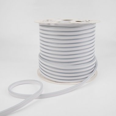 Гибкий неон белого цвета с напряжением 24 В работает в режиме постоянного свечения и поставляется в бухтах 50 м.