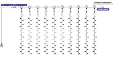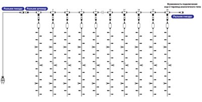 Гирлянда "Светодиодный Дождь" представляет собой гибкий горизонтальный шнур-шину (2м), к которому через определенные промежутки крепятся вертикальные нити (20 шт.) со светодиодными лампами, которые отличаются от «Бахромы» тем, что имеют одинаковую, достаточно значительную длину, часто превышающую протяженность шины. На концах каждой шины есть разъем и штепсель, которые предназначены для последовательного соединения нескольких световых дождей в большой занавес ПЛЕЙ-ЛАЙТ. Используя занавес, можно не только создавать красивые световые занавесы или оформлять различные плоскости, например, фасады домов, окна и т.д., но и украшать объемные объекты.