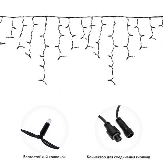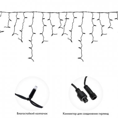 Гирлянда имитирует сосульки и может послужить оригинальным решением при украшении карнизов, арок, фасадов зданий, витрин магазинов, а также стать эффектным элементом декора внутри помещений.