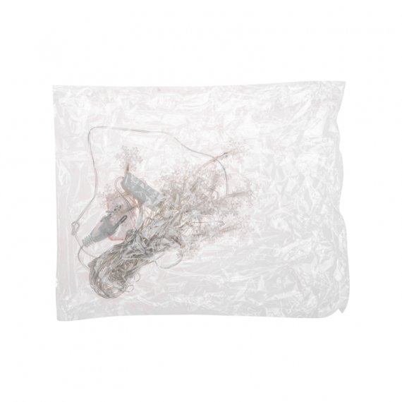 Украшение выполнено в виде серебристого шнура в прозрачной ПВХ оболочке, на котором расположены насадки в виде снежинок.
