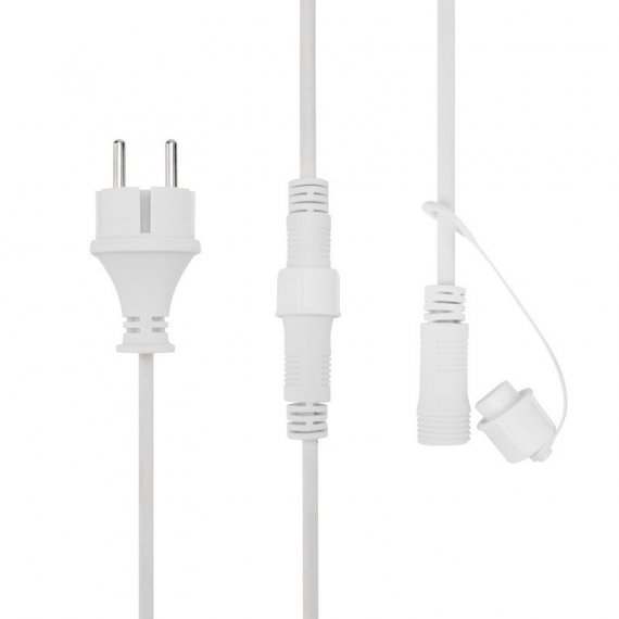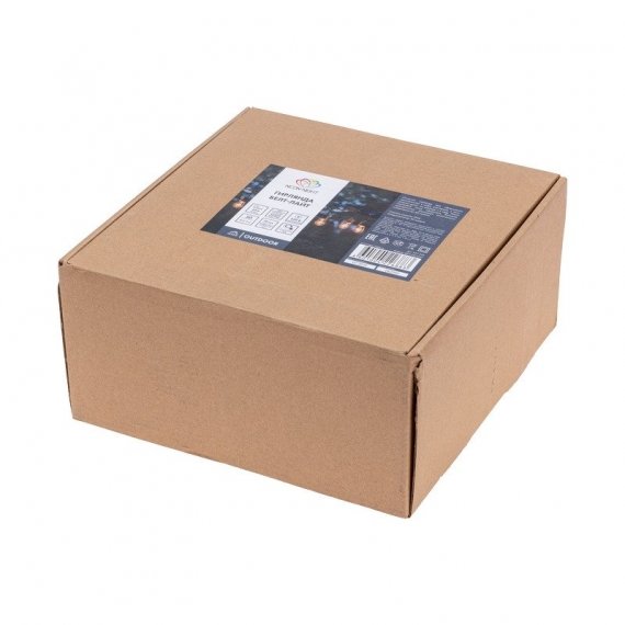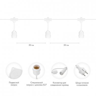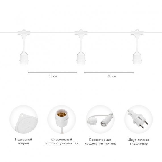 20-метровый шнур оснащен 40 подвесными патронами с цоколем Е27. Патроны располагаются на иллюминационном кабеле с шагом 50 см. Для подключения к сети предусмотрен 3-метровый шнур с евровилкой. Провод находится в надежной изоляции из морозостойкого каучука. Вся конструкция защищена от влаги и пыли по стандарту IP44, поэтому предполагается размещение как дома, так и на улице. Для удобства использования предусмотрена возможность соединения гирлянды до 4-х комплектов.