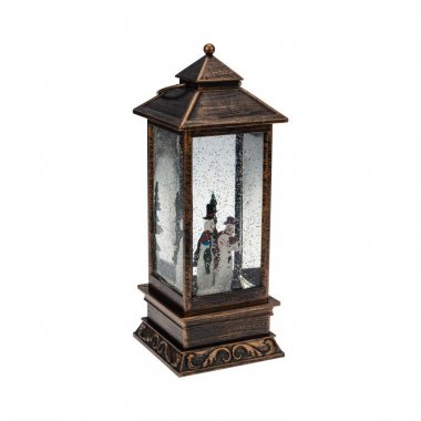 Декоративный фонарь с эффектом снегопада и подсветкой «Новый год» перенесет вас в атмосферу зимней сказки, где среди праздничных огней и домашнего уюта стоит наряженная елка, а дети радуются подаркам. Оригинальное интерьерное украшение выполнено в бронзовом цвете, внутри колбы находятся фигурки ели и Снеговиков. Вихрь серебристых блесток, подсвечиваемых диодами теплого оттенка, имитирует зимнюю вьюгу. Фонарь питается от 3 батареек типа AA и может работать через USB-кабель с сетевым адаптером.