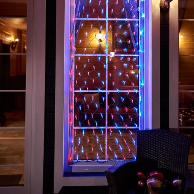 Гирлянда-сеть представляет из себя конструкцию ввиде прямоугольника размером 2*0,7 метра, разбитого на равные ромбы, в углах которых находятся диоды красного и синего цвета, причем диоды чередуются по линии. Гирлянда имеет степень влагозащиты IP44 и ПВХ провод черного цвета, что позволит вам быстро и выгодно решить вопрос с декоративным украшением любых объектов как внутри помещения, так и снаружи. В комплекте идет контроллер с 8 режимами свечения, что позволяет гирлянде работать в динамике. Данная гирлянда используется для украшения фасадов и потолков зданий практически любой площади, отлично подходит для украшения небольших кустов, растяжки между направляющими в беседке или веранде, ей можно легко и быстро обмотать колонны или столбы, служит красивым декором окон зданий. Гирлянда-сеть имеет самое лучшее отношение цены к площади декорирования относительно других гирлянд, что делает ее уникальной в своем роде.