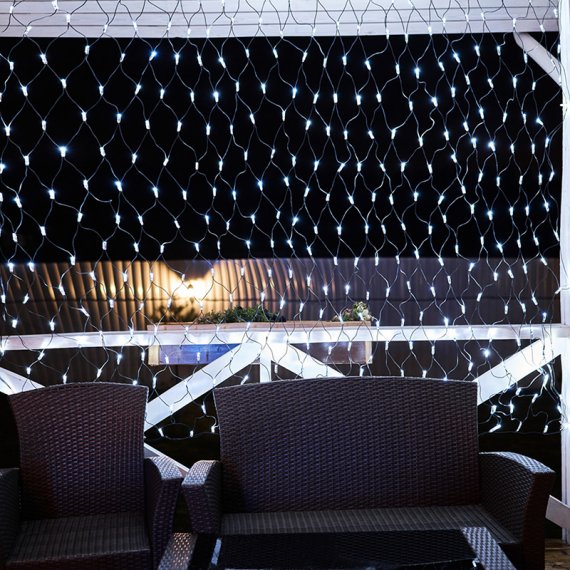 Гирлянда-сеть представляет из себя конструкцию ввиде прямоугольника размером 2,5*2,5 метра, разбитого на равные ромбы, в углах которых находятся диоды белого цвета. Гирлянда имеет степень влагозащиты IP44 и ПВХ провод черного цвета, что позволит вам быстро и выгодно решить вопрос с декоративным украшением любых объектов как внутри помещения, так и снаружи. В комплекте идет контроллер с 8 режимами свечения, что позволяет гирлянде работать в динамике. Данная гирлянда используется для украшения фасадов и потолков зданий практически любой площади, отлично подходит для украшения небольших кустов, растяжки между направляющими в беседке или веранде, ей можно легко и быстро обмотать колонны или столбы, служит красивым декором окон зданий. Гирлянда-сеть имеет самое лучшее отношение цены к площади декорирования относительно других гирлянд, что делает ее уникальной в своем роде.