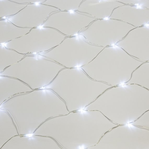 Гирлянда-сеть представляет из себя прозрачное полотно ввиде квадрата размером 1,5*1,5 метра, разбитого на равные ромбы, в углах которых находятся диоды белого цвета.