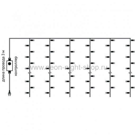 Гирлянда "Светодиодный Дождь" ("Занавес") представляет собой гибкий горизонтальный шнур-шину, к которому через определенные промежутки крепятся вертикальные нити равной длины со светодиодами.