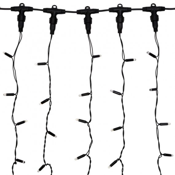 Гирлянда "Светодиодный Дождь" представляет собой гибкий горизонтальный шнур-шину (2м), к которому через определенные промежутки крепятся вертикальные нити (20 шт.) со светодиодными лампами, которые отличаются от «Бахромы» тем, что имеют одинаковую, достаточно значительную длину, часто превышающую протяженность шины. На концах каждой шины есть разъем и штепсель, которые предназначены для последовательного соединения нескольких световых дождей в большой занавес ПЛЕЙ-ЛАЙТ. Используя занавес, можно не только создавать красивые световые занавесы или оформлять различные плоскости, например, фасады домов, окна и т.д., но и украшать объемные объекты.