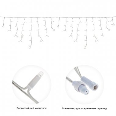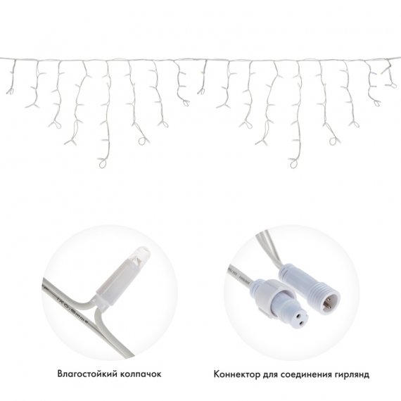 Данная гирлянда имеет Теплый белый цвет свечения и предназначена для использования как внутри помещения, так и снаружи.