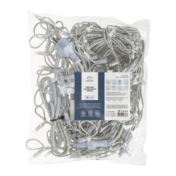 Гирлянда "Бахрома" ("Айсикл") представляет собой гибкий горизонтальный шнур-шину, к которому через определенные промежутки крепятся вертикальные нити разной длины со светодиодами. Она имитирует сосульки и может послужить эффектным и оригинальным решением при декорировании карнизов домов, арок, фасадов зданий, витрин магазинов, а также стать элементов декора внутренних интерьеров помещений.