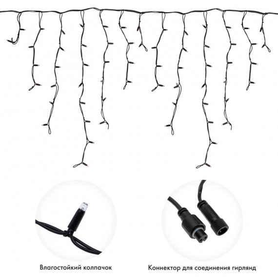 Гирлянда «Бахрома» («Айсикл») представляет собой гибкий горизонтальный шнур-шину, к которому через определенные промежутки крепятся вертикальные нити разной длины со светодиодами. Она имитирует сосульки и может послужить эффектным и оригинальным решением при декорировании карнизов домов, арок, фасадов зданий, витрин магазинов, а также стать элементом декора внутренних интерьеров помещений. Благодаря использованию в гирлянде светодиодов, ее отличительной особенностью является превосходная яркость и низкое энергопотребление по сравнению с лампами накаливания. При длине 3,2 метра гибкая направляющая имеет 24 вертикальные нити от 20 до 60 см. Данная гирлянда имеет теплый белый цвет свечения и предназначена для использования как внутри помещения, так и снаружи. Важной особенностью данного исполнения является каучуковый провод, благодаря которому гирлянду отличает высокая надежность в условиях российского климата, даже в самых холодных регионах страны.