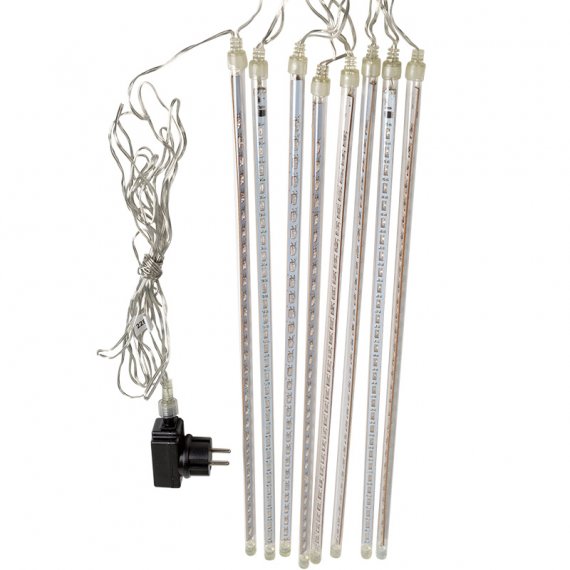 Светодиодная гирлянда «Тающие сосульки» - это оригинальное, красивое и современное средство оформления фасадов и интерьеров зданий, деревьев, витрин и т.д. Она представляет собой комплект из 8 прозрачных пластиковых трубок, расположенных на расстоянии 40 см друг от друга. По всей длине каждой трубки внутри надежно закреплена плата со светодиодами и микрочипом, обеспечивающим динамику с эффектом стекающей капли. Длина каждой трубки 50 см, диамерт 12 мм. Гирлянда работает от напряжения 24 V и имеет влагозащищённое исполнение, что позволяет безопасно использовать её как в помещении, так и на улице. Адаптер для подключения идёт в комплекте с гирляндой.