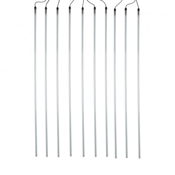 Светодиодная гирлянда «Тающие сосульки» – это оригинальное, красивое и современное средство оформления фасадов и интерьеров зданий, деревьев, витрин и т. д. Она представляет собой комплект из 10 прозрачных пластиковых трубок, расположенных на расстоянии 100 см друг от друга. По всей длине каждой трубки внутри надежно закреплена плата со светодиодами и микрочипом, обеспечивающим динамику с эффектом стекающей капли. Длина каждой трубки 100 см. Гирлянда работает от напряжения 24 V, трансформатор идет в комплекте.