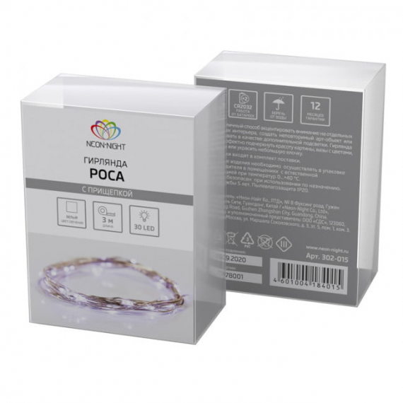 Гирлянда «Роса» с прищепкой 3 м, 30 LED, белое свечение, 2хCR2032 в комплекте NEON-NIGHT