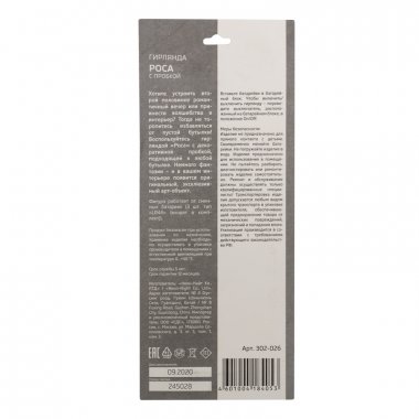 Хотите устроить второй половинке романтичный вечер или привнести волшебства в интерьер? Тогда не торопитесь избавляться от пустой бутылки! Воспользуйтесь гирляндой «Роса» с декоративной пробкой, подходящей к любой бутылке. Немного фантазии - и в вашем интерьере появится оригинальный, эксклюзивный арт-объект. Такой аксессуар можно использовать в качестве ночника, декоративного элемента в интерьере или в составе необычной композиции. Гирлянда состоит из тонкого провода длиной 2 метра, с расположенными на нем 20 теплыми белыми долговечными светодиодами. В качестве питания у данной модели гирлянды выступают батарейки 3хLR44, которые идут в комплекте.