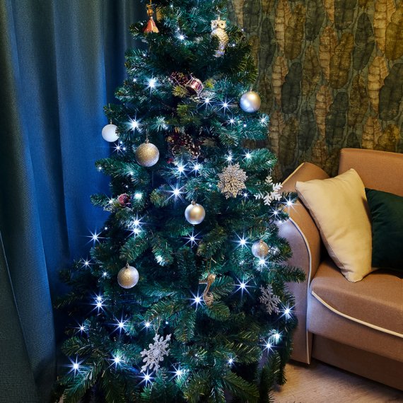 Гирлянду «Твинкл лайт» представляет собой общий провод с последовательно расположенными коротенькими отводами, направленными в разные стороны. На концах этих «отростков» расположены яркие светодиоды. Для создания праздничной светодинамики в общий провод встроен многопрограммный контроллер, который позволяет управлять 8 режимами свечения. Гирлянду «Твинкл лайт» создали в расчете на использование в качестве елочного украшения, в ее семейство входят самые разные гирлянды. Они различаются длиной, цветом и количеством светодиодов. Данная гирлянлда предназначена для домашнего использования. Светодиодные гирлянды имеют бесспорное преимущество перед ламповыми. Ресурс светодиодов составляет 30 000 ч. Благодаря малому энергопотреблению, рекордному ресурсу, высокой яркости, разнообразию и насыщенности цветов свечения они стали весьма привлекательным для потребителей. «Твинкл лайт» используют в качестве елочной гирлянды для украшения елей. Также гирлянда широко применяется для оформления различных витрин, окон, элементов интерьера и разнообразных экспозиций.