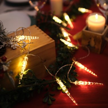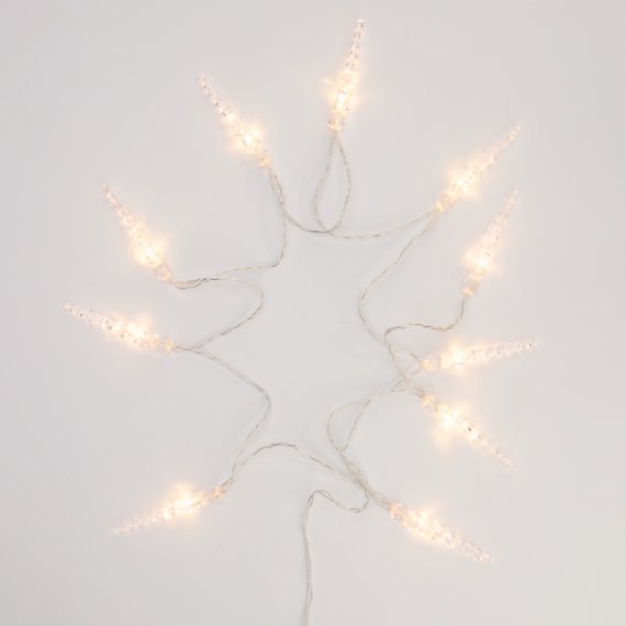 Светодиодная гирлянда «Сосульки» длиной 1,5 метра — идеальное решение для создания праздничного декора в преддверии Нового года. 10 насадок в виде сосулек ярко подсвечиваются диодами, которые излучают теплый белый свет. Необычный дизайн, тематическое исполнение, независимость от электрической сети и абсолютная безопасность открывают большие возможности в оформлении интерьера. Гирлянда питается от двух элементов типа АА, для которых предусмотрен отдельный блок с крышкой и клавишей ON/OFF. Изделие IP20 предназначено для использования дома, в офисе, магазине и других помещениях со стандартными условиями.