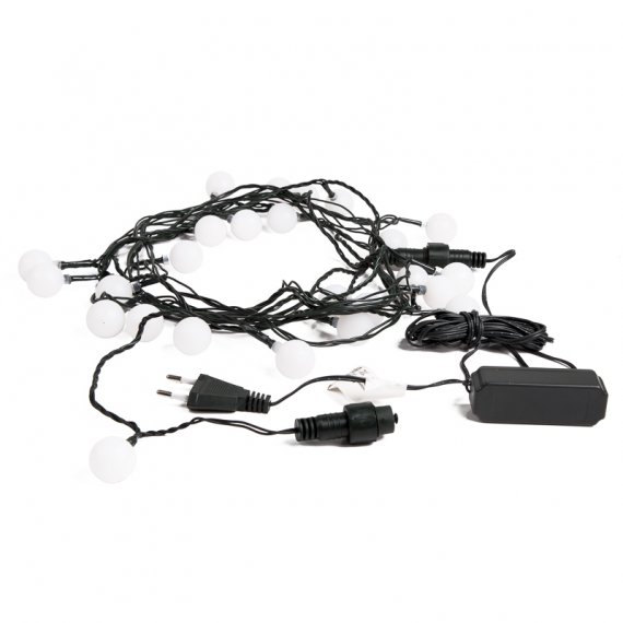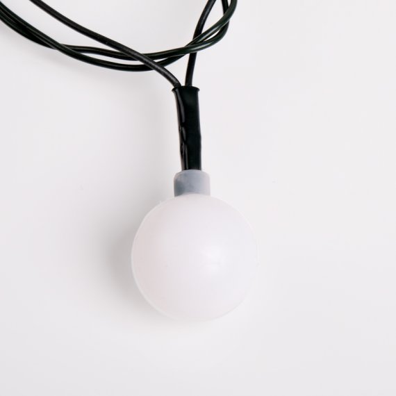 Данная гирлянда имеет длину 5м на которой расположено 25 шариков диаметром 23мм с цветом свечения светодиодов RGB.