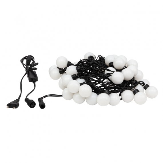 Данная гирлянда имеет длину 10м. на которой равномерно расположены 40 шариков диаметром 45мм с цветом свечения RGB.