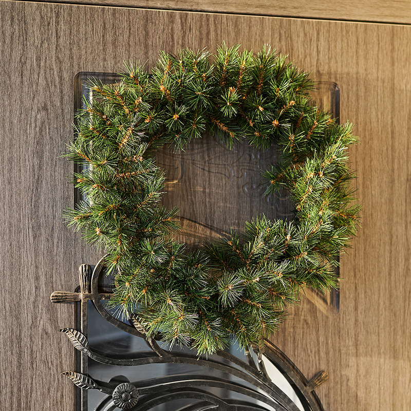 Еловый венок диаметром 60 см выполнен в виде молодых сосновых веточек, сплетенных в кольцо. Пушистая хвоя из лески смотрится максимально реалистично и прослужит более 5 лет, в отличие от натуральной елки. Можно использовать декоративное изделие как дома, так и на улице. Венок станет прекрасным украшением входной двери, окон, мебельных фасадов, стен. Пушистые ветки можно дополнить шарами, светодиодными фигурками, гирляндами и мишурой.