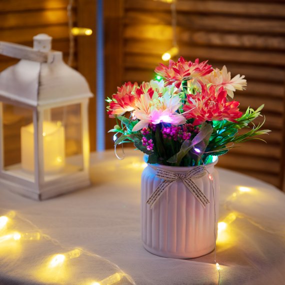 Светодиодная гирлянда «Роса» – прекрасный декоративный элемент, светящийся разными огоньками и создающий атмосферу праздника и уюта. Это отличный способ акцентировать внимание на отдельных предметах интерьера, создать неповторимый арт-объект или использовать в качестве дополнительной подсветки. Гирлянда может эффектно подчеркнуть красоту картины, вазы с цветами, статуэтки или украсить небольшую елочку. Часто «Роса» украшает не только интерьер, но и с успехом применяется на торговых площадках и ярмарках для привлечения внимания к продукции. Гирлянда состоит из тонкого провода длиной 2 метра, с расположенным на нем 20 разноцветными долговечными светодиодами. В качестве питания у данной модели гирлянды выступает USB-разъем, который крепится на дополнительный провод длиной 30 см. Создайте атмосферу праздника с помощью светодиодной гирлянды «Роса»!