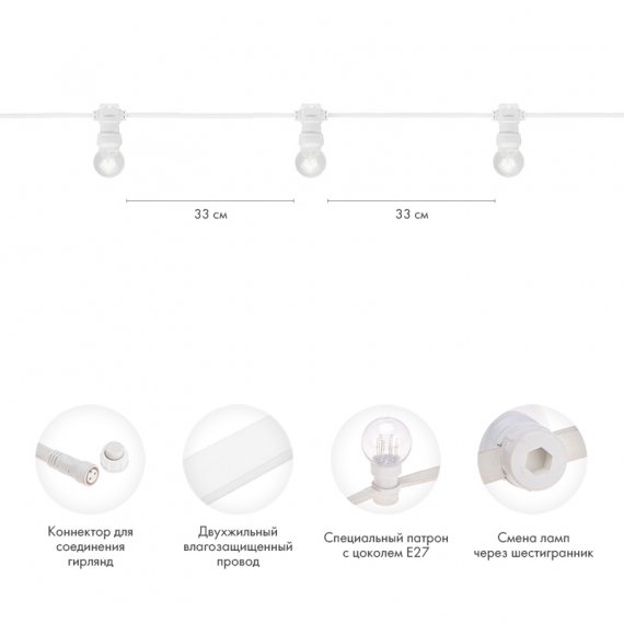 Специально подготовленный комплект 10м гирлянды "Belt Light" с уже установленными светодиодными лампами. Теперь Вам не потребуется много времени на подготовку, разрезание единой гирлянды "Belt Light", подключение каждого куска в отдельности и вкручивание ламп в каждый патрон, потому что специально для Вас мы сформировали 10-ти метровые комплекты с подключенным 1,5м проводом питания с вилкой, которые останется только повесить и включить в сеть 220В. Шаг ламп 40 см.