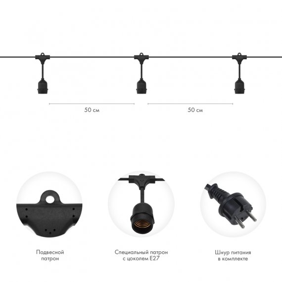 «Белт-Лайт» 2 жилы 10 м, черный каучук, шаг 50 см, 20 подвесных патронов Е27, шнур 3 м, IP44, соединяется