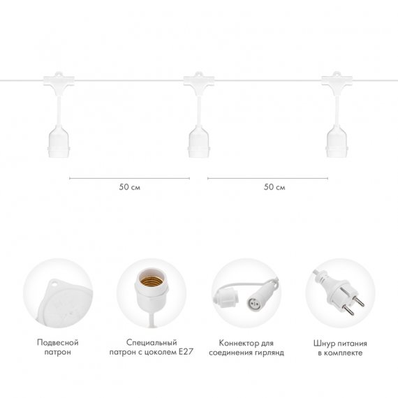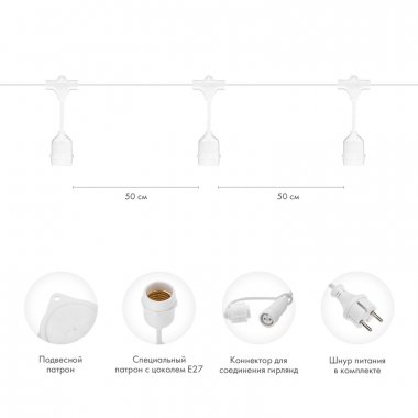 «Белт-Лайт» 2 жилы 10 м, белый каучук, шаг 50 см, 20 подвесных патронов Е27, шнур 3 м, IP44, соединяется
