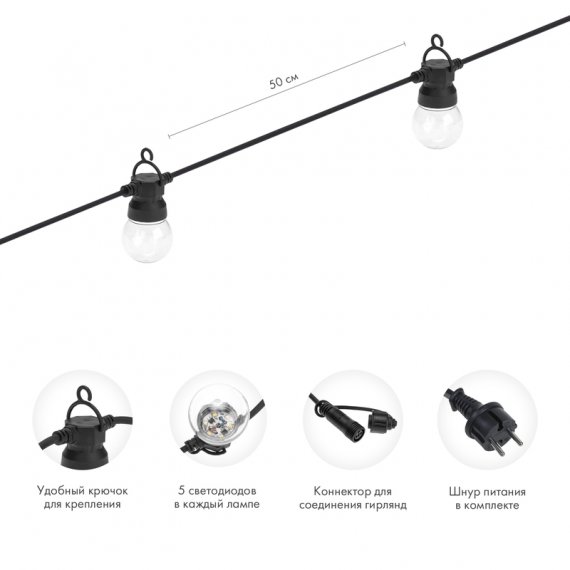Уличная гирлянда «Лофт» выполнена на основе гирлянды «Белт-Лайт» и представляет собой готовый к использованию комплект с уже установленными в патроны прозрачными светодиодными лампами. Выполнена из электрического провода длиной 10 метров, заключенного в изоляционную оболочку из морозостойкого, гибкого, прочного каучука черного цвета. Гирлянда имеет защиту по стандарту IP44 – не боится попадания водных брызг, поэтому подходит для размещения как дома, так и на улице. Диапазон рабочих температур –25...+40 °С.