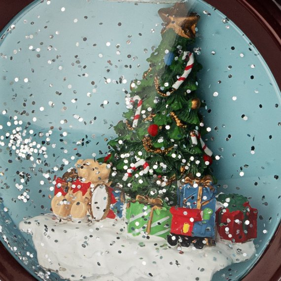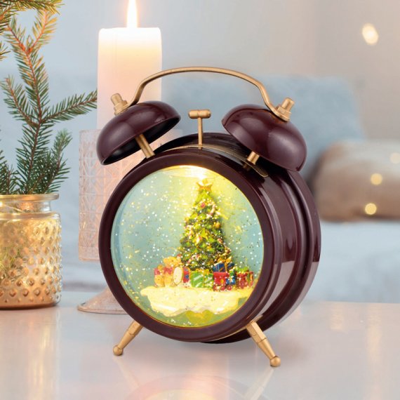 Декоративный светильник «Часы» выполнен в виде классического будильника, у которого вместо циферблата установлена прозрачная колба со специальной жидкостью. Внутри находится яркая композиция из новогодней елки, окруженной подарками. 2 диода, излучающих теплый белый свет, создают эффектную подсветку, которая может использоваться во время ночного сна. Золотистое конфетти имитирует зимний снегопад и заставляет подолгу наблюдать за причудливым танцем сверкающих частиц. Светильник питается от 3 батареек типа АА, что гарантирует полную безопасность использования. В комплекте идет USB-кабель.