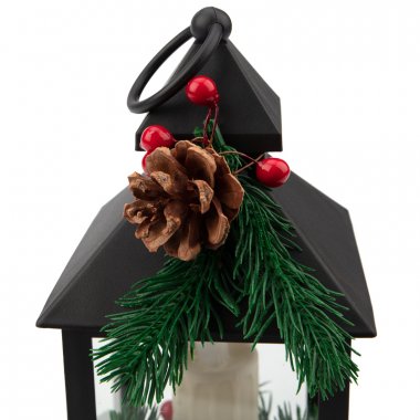 Декоративный фонарь со свечкой и шишкой, черный корпус, размер 10,7x10,7x23,5 см, цвет теплый белый