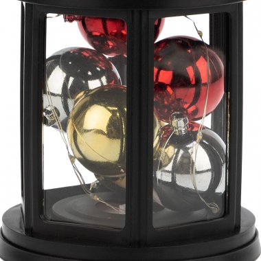 Декоративный фонарь с шариками олицетворяет тепло и домашний уют в преддверии Нового года, помогает сделать домашние вечера в кругу семьи комфортными и поднимает настроение окружающим. Оригинальное изделие в корпусе черного цвета станет стильным дополнением праздничной обстановки. Для подвешивания предусмотрено кольцо в верхней части. Экономичные диоды, подсвечивающие композицию, излучают теплый белый свет. В качестве элементов питания используются 3 батарейки типа ААА, которые делают фонарь мобильным — для работы не нужна розетка.